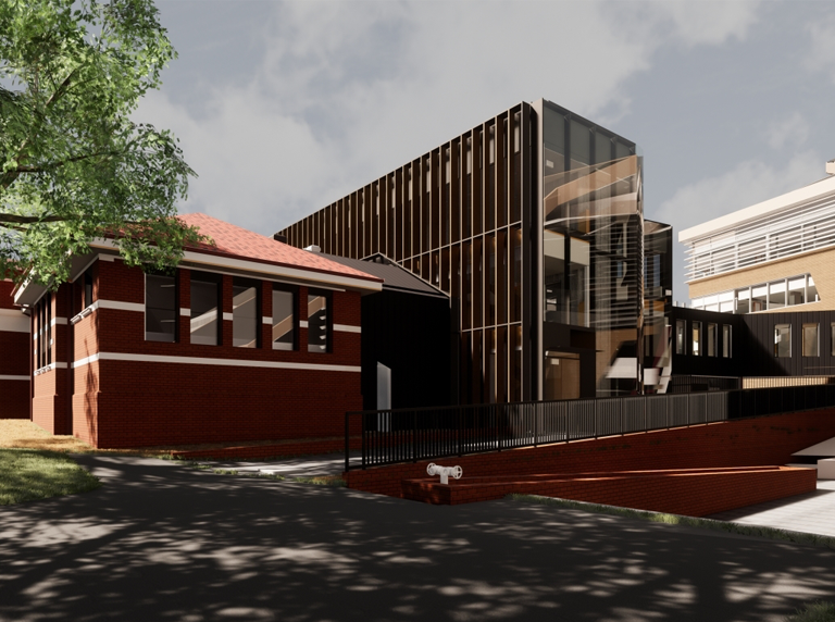 Three storey, mass timber laboratory building.