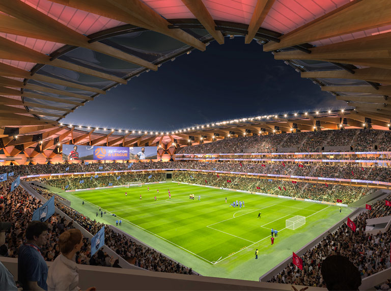 Proposed sports stadium with world-class functionality and beauty and a minimal carbon footprint.
